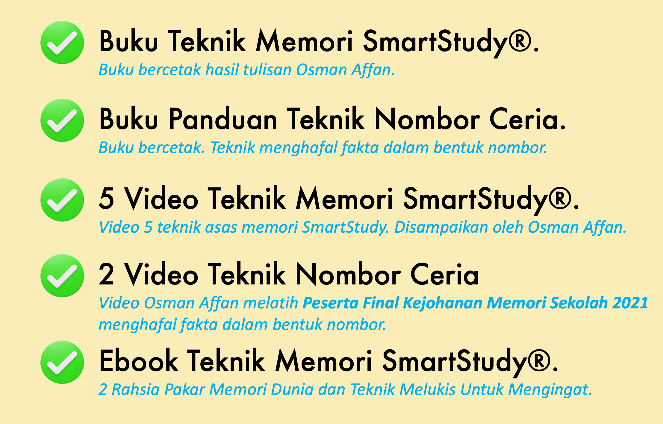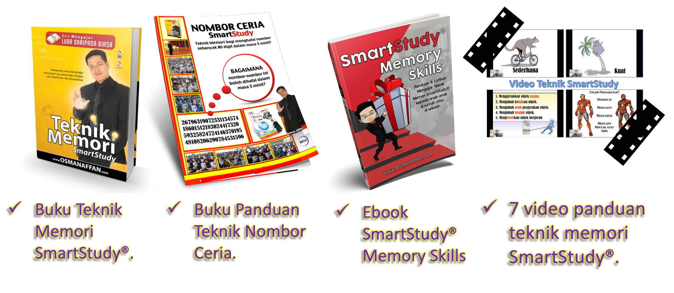 Ebook berharga RM40 ini adalah hasil tulisan Tuan Osman Affan. Ia akan diberikan secara percuma kepada semua pembeli buku teknik memori SmartStudy ini.