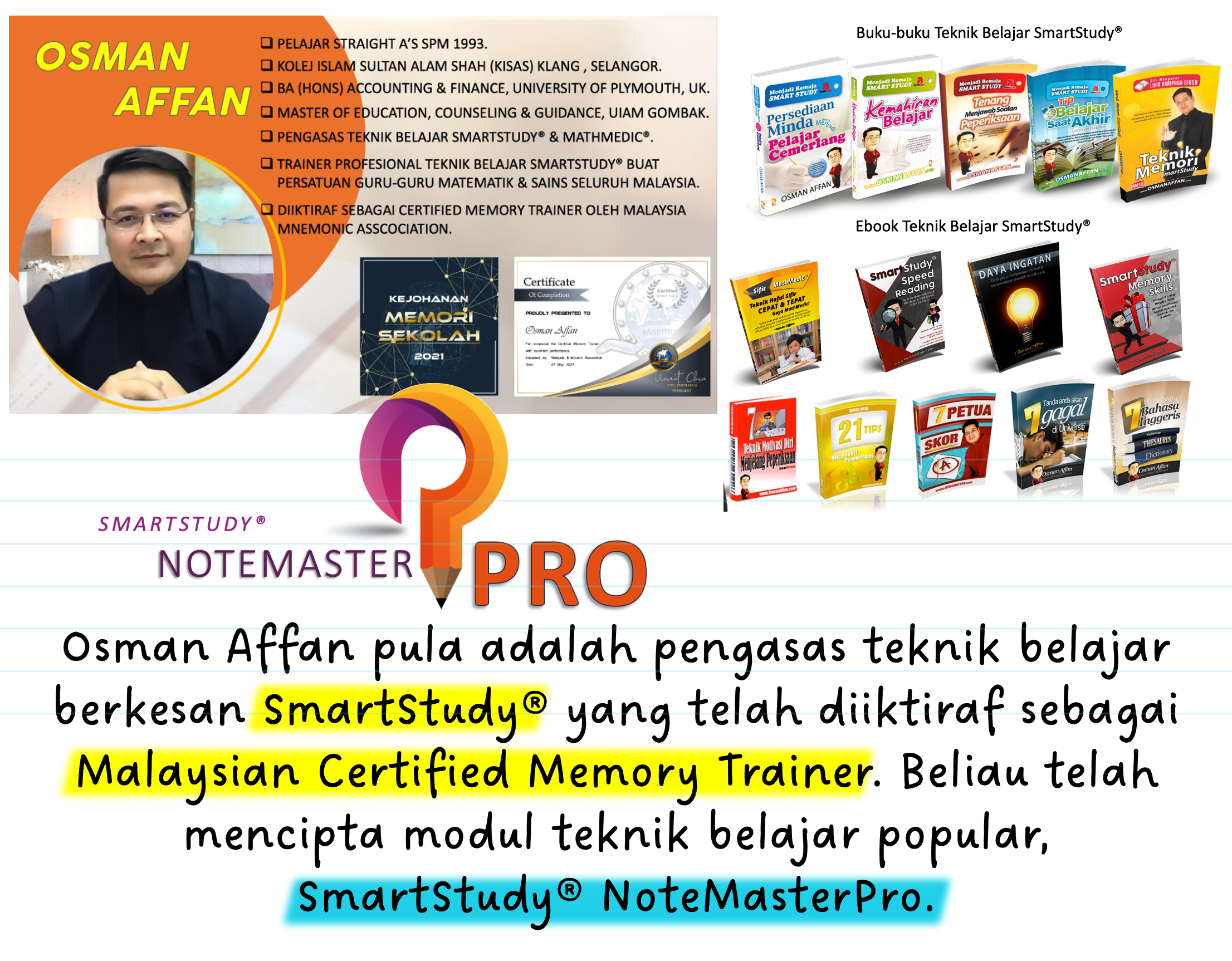 Osman Affan adalah seorang Trainer Profesional & telah mengajar & mengasaskan Teknik Belajar SmartStudy® sejak tahun 2004.
