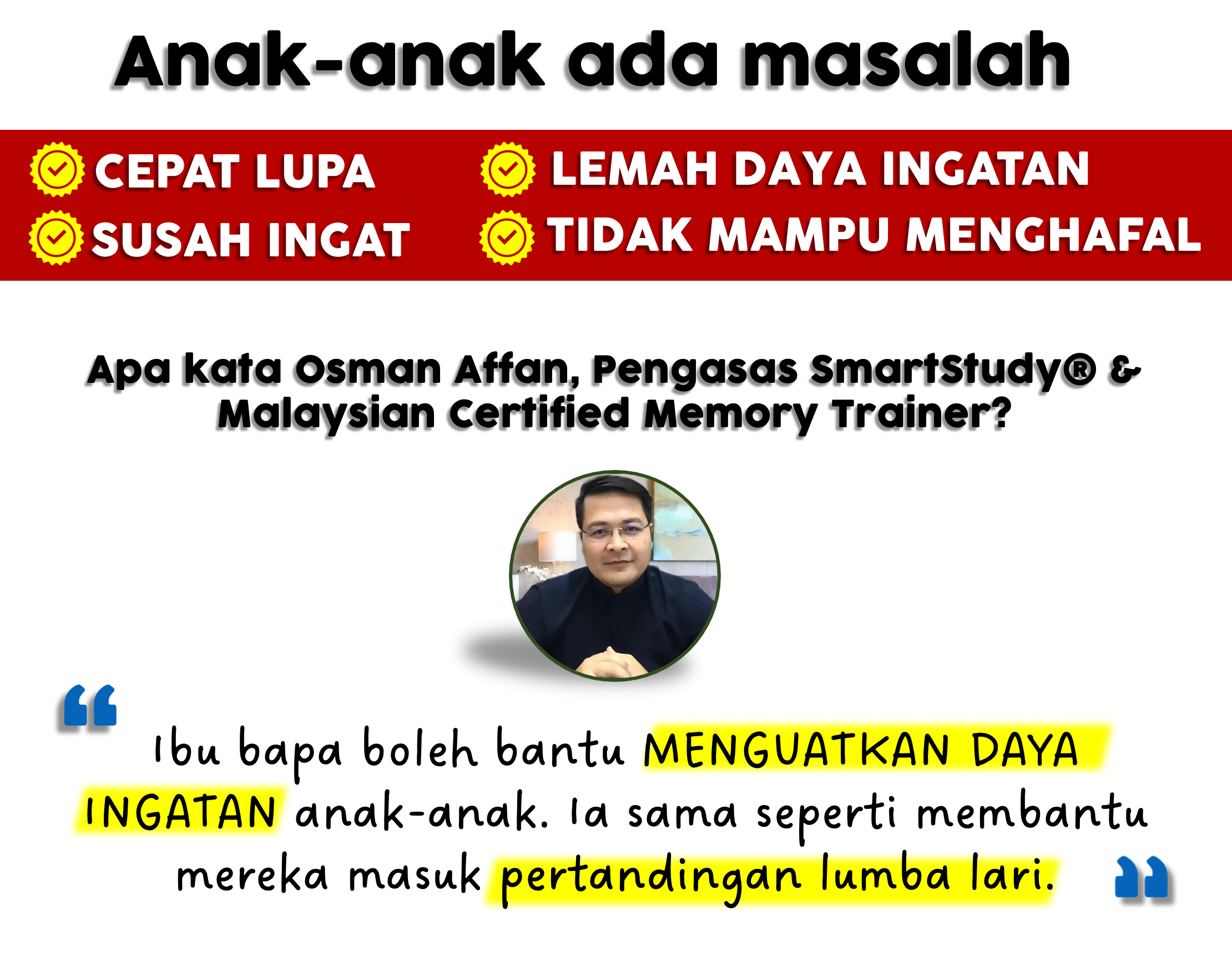 Bengkel ini akan diajarkan sendiri oleh Osman Affan, bekas pelajar straight A's, pengasas SmartStudy® & diiktiraf sebagai Malaysian Certified Memory Trainer oleh Malaysia Mnemonic Association.